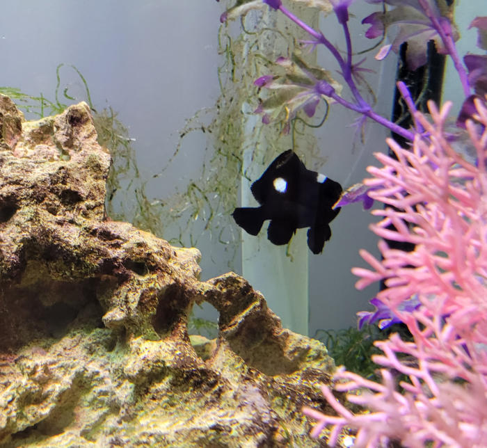 I call this fish White Spot. It lives in our saltwater tank. He is in there alone because he ate all his friends.